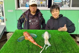 船外機ボートで坂下さんがアオリイカ、ホウボウをゲット。