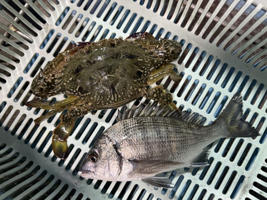 カセ釣りで伊藤さんがチヌ、ワタリガニをゲット。