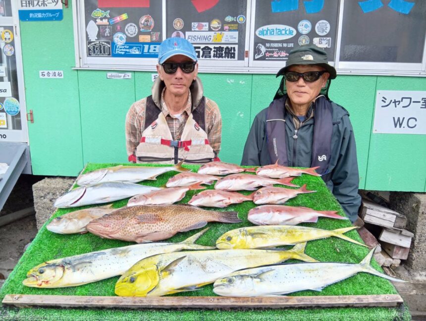 船外機ボートで尾垣さんがシイラ、マダイ、オオモンハタをゲット。