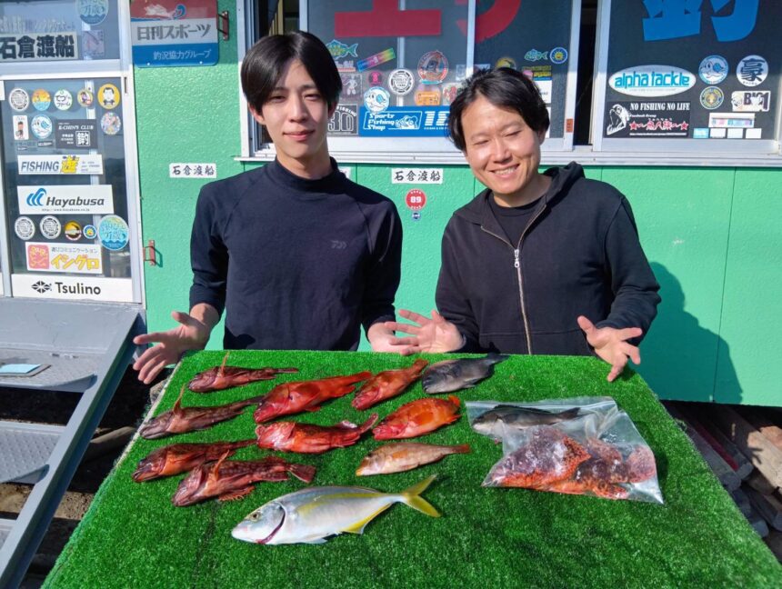 船外機ボートで田中さんがカサゴ、アカハタ、グレをゲット。