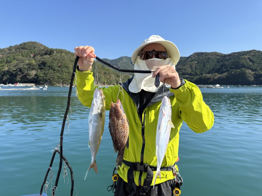 船外機ボートで堤さんがカワハギ、アカハタ、カサゴをゲット。