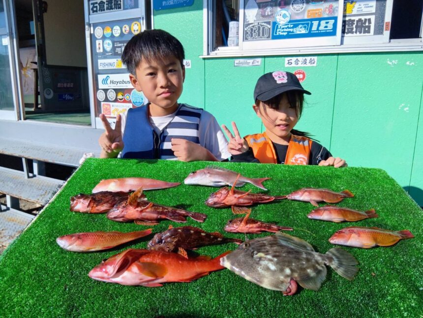 船外機ボートでふうがくん&ことねちゃんがアカハタ、カサゴ、カワハギをゲット。
