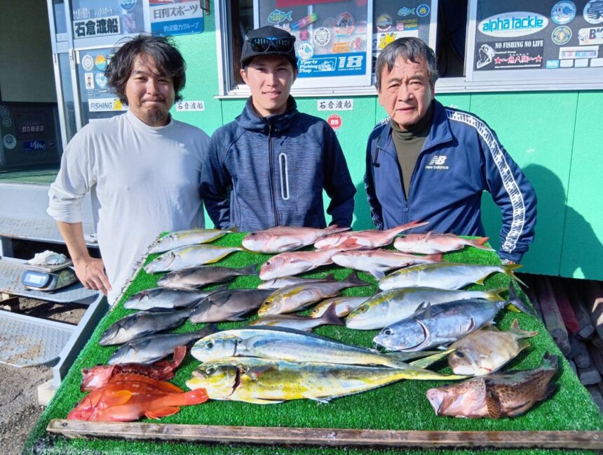 船外機ボートで石丸さんがシマアジ、グレ、イサキ、シイラ、ソウダカツオをゲット。