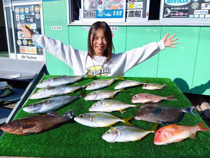 船外機ボートでことみちゃんがシマアジ、ツバス、マダイ、オオモンハタ、サンノジをゲット。
