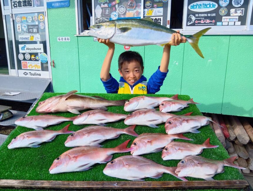 船外機ボートでことみちゃんがシマアジ、ツバス、マダイ、オオモンハタ、サンノジをゲット。