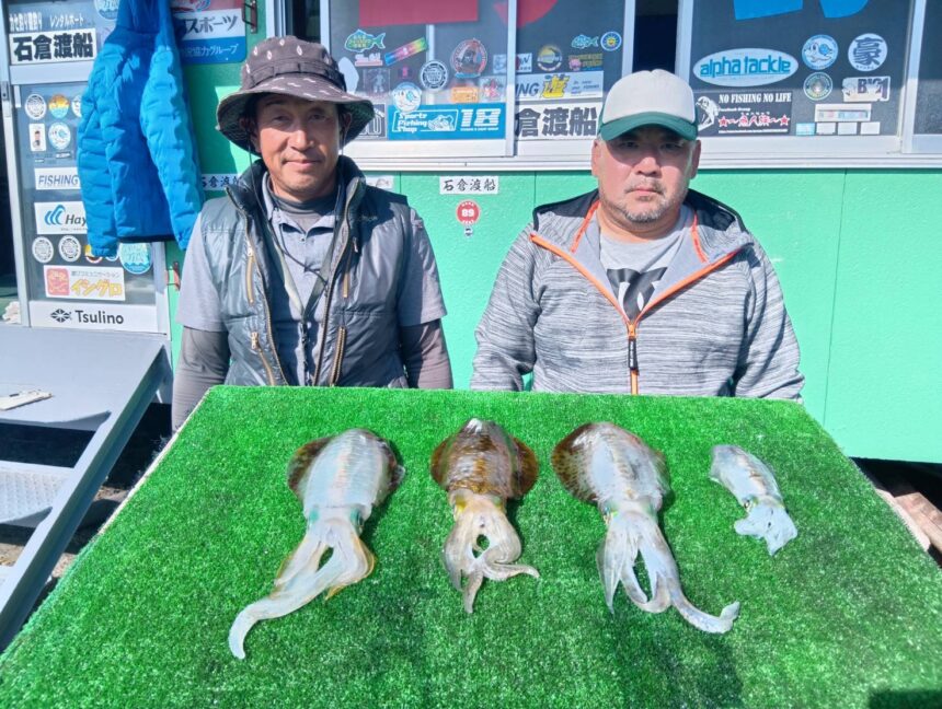 船外機ボートで吉田さんがアオリイカをゲット。