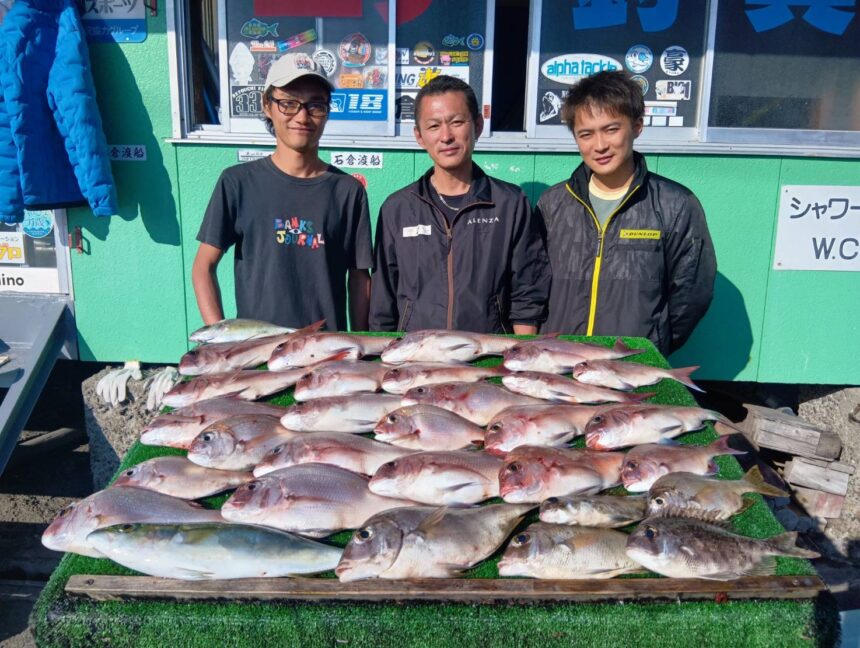 船外機ボートで山田さんがマダイ、ツバス、メイチをゲット。
