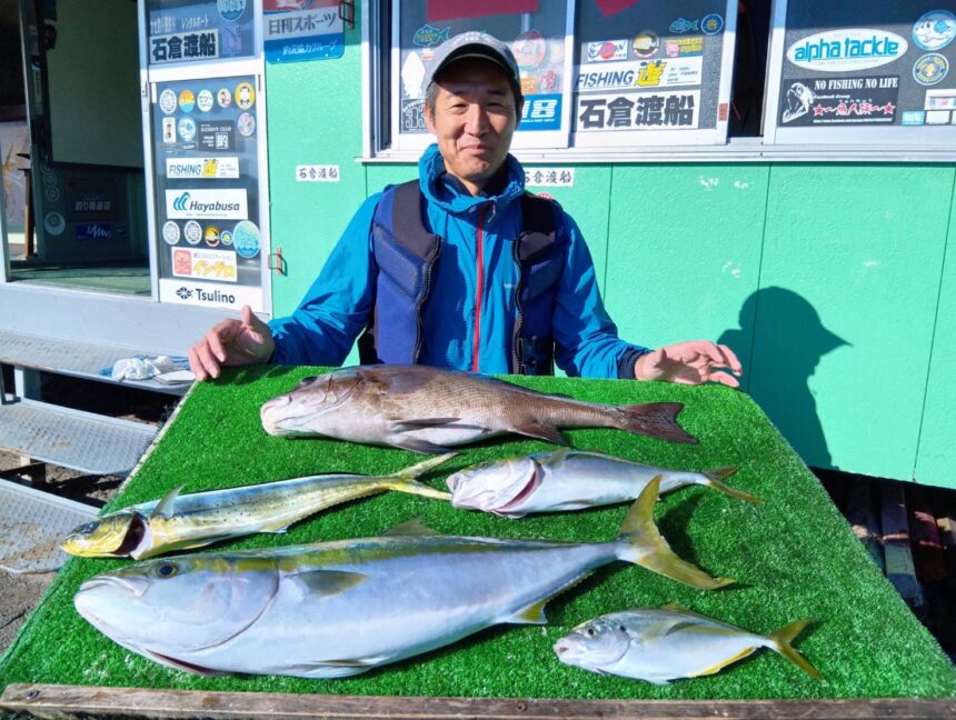 船外機ボートで三輪さんがコロダイ、ワラサ、ツバス、シイラ、シマアジをゲット。