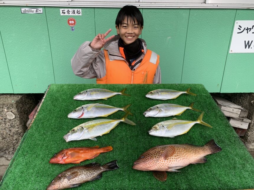 船外機ボートでたいせい君がシマアジ、オオモンハタ、アカハタをゲット。