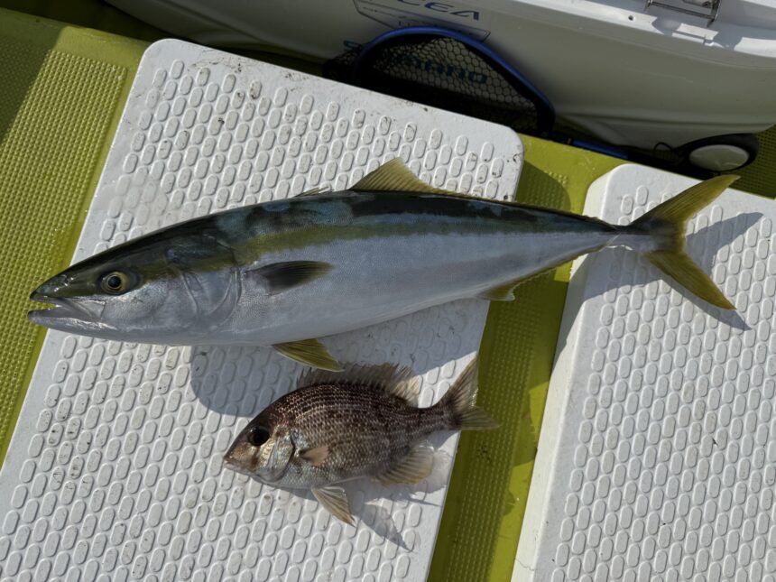 船外機ボートで田中さんがワラサ、メイチをゲット。