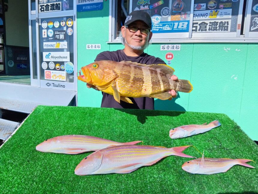 船外機ボートで北川さんがグレ、オオモンハタ、マダイをゲット。