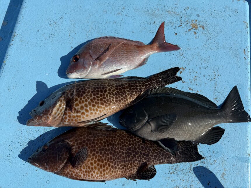 船外機ボートで北川さんがグレ、オオモンハタ、マダイをゲット。