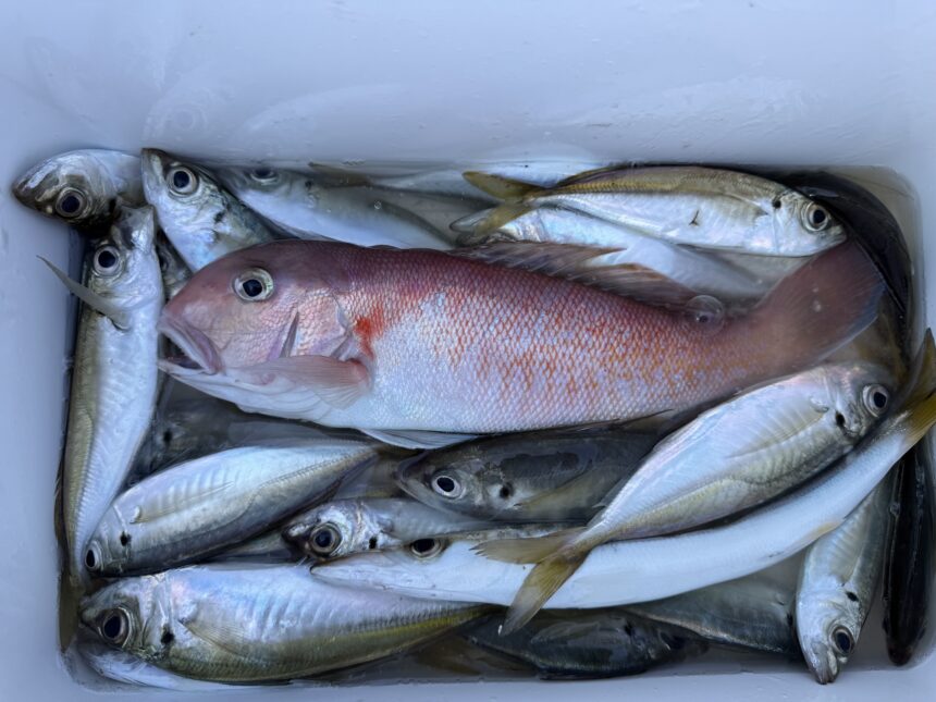 船外機ボートで海苔さんがアオハタ、イトヨリ、シロアマダイをゲット。