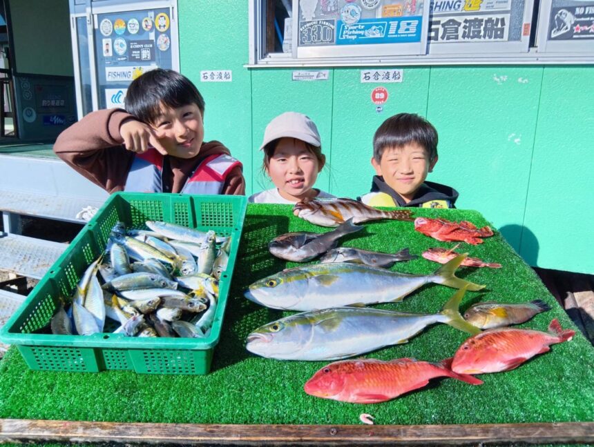 船外機ボートでぎんじ君、やひこ君、あんりちゃんがアジ、ツバス、タカノハをゲット。