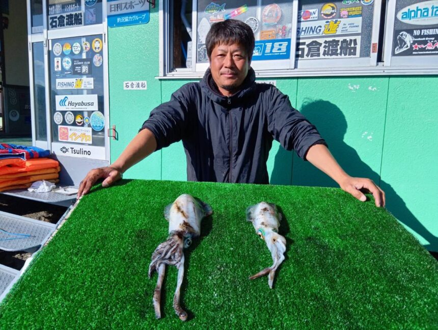 手漕ぎボートで風間さんがアオリイカをゲット。
