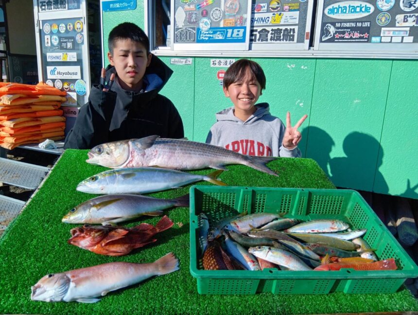 船外機ボートでのあ君&けんすけ君がツバス、イサキ、カサゴ、シロアマダイ、ボラ、アジをゲット。