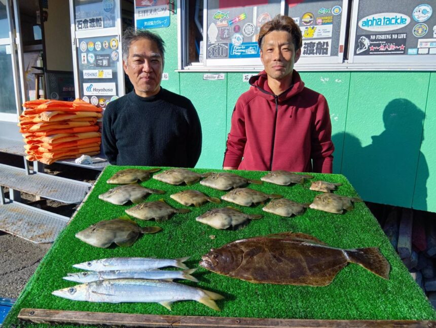 手漕ぎボートで大野さんがカワハギ、ヒラメ、カマスをゲット。