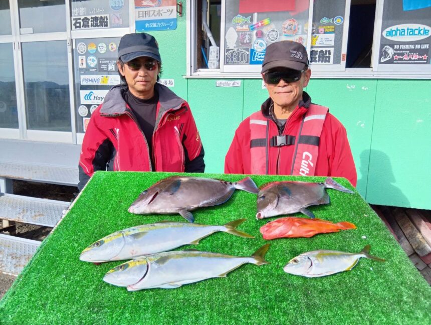 船外機ボートで丹羽さんがカワハギ、サンバソウ、ウマヅラハギ、シイラ、ツバスをゲット。