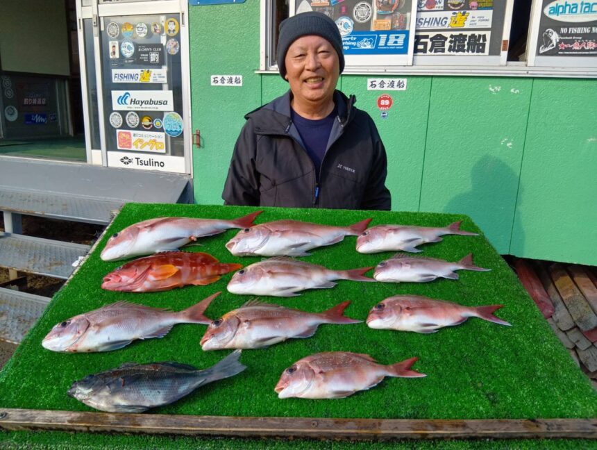 船外機ボートで小川さんがマダイ、ツバス、カワハギ、アカハタをゲット。