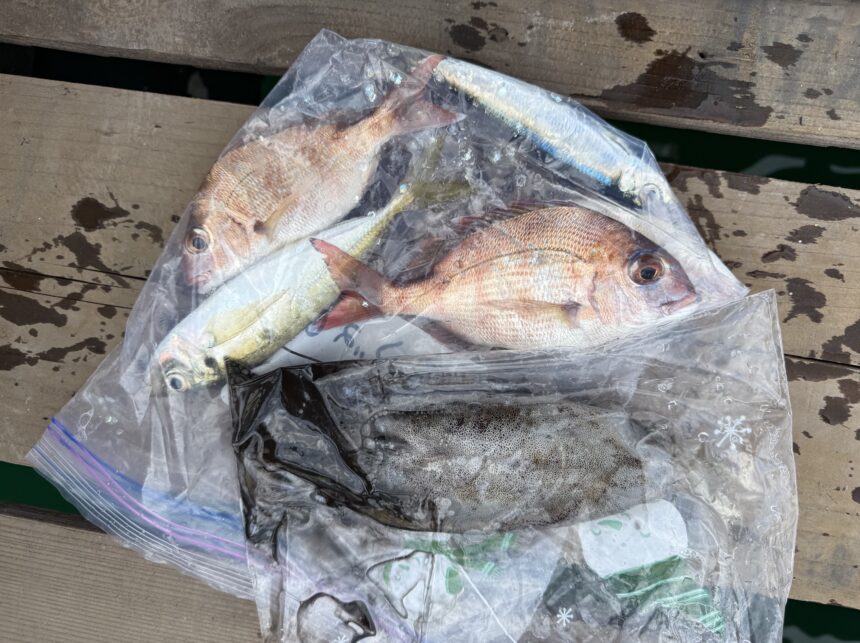 船外機ボートで早川さんがマダイ、カワハギ、シイラ、ツバスをゲット。