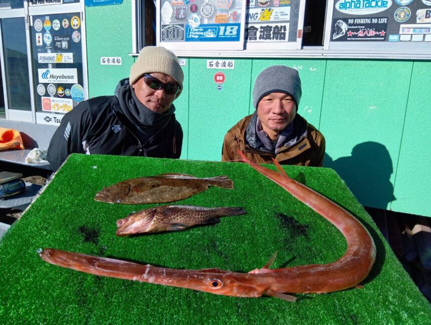 船外機ボートで奥山さんがアカヤガラ、ヒラメ、オオモンハタをゲット。