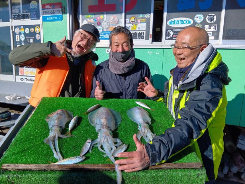 船外機ボートで津森さんがマダイ、アオリイカをゲット。