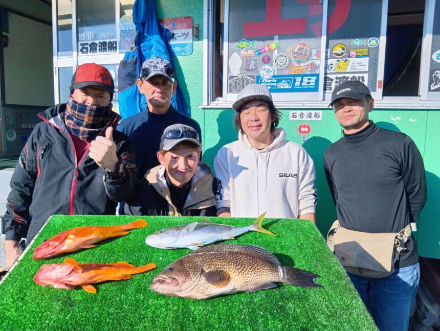 船外機ボートで中尾さんがツバス、オオモンハタ、アカハタをゲット。