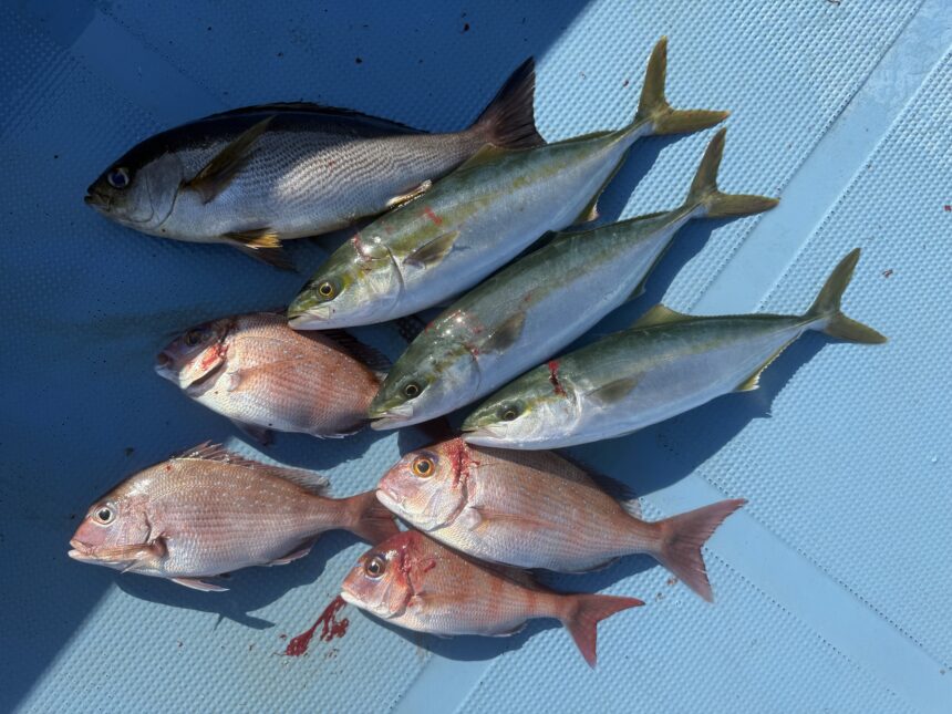 船外機ボートで北川さんがイサキ、ツバス、マダイをゲット。