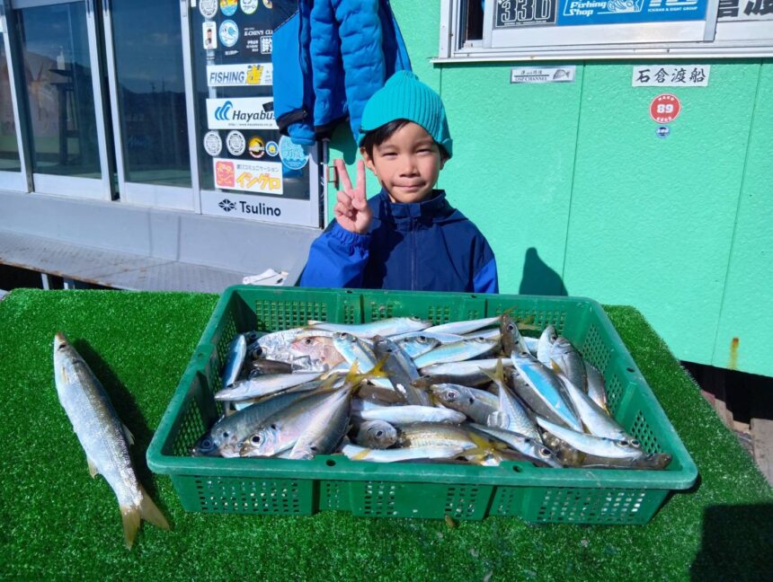 手漕ぎボートでけい君がアジ、カマスをゲット。