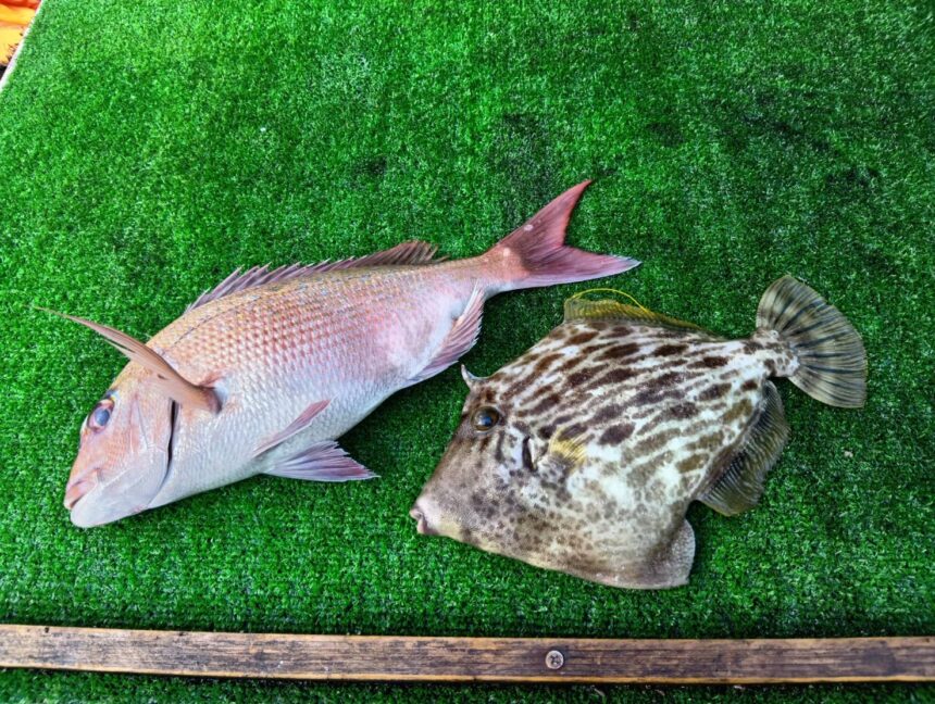 船外機ボートで駒田さんがマダイ、カワハギをゲット。
