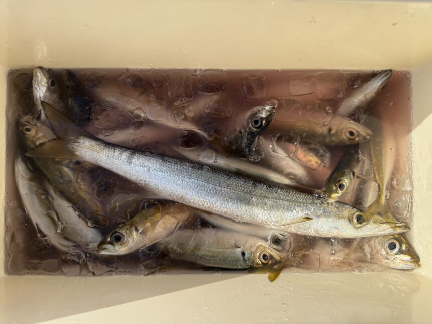 手漕ぎボートでMさんがカマス、アジをゲット。