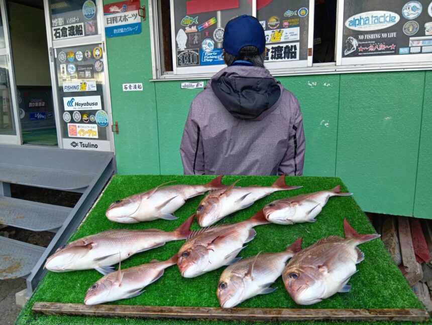 船外機ボートで荒木さんがマダイ、オオモンハタ、タカノハ、オジサン、グレをゲット。