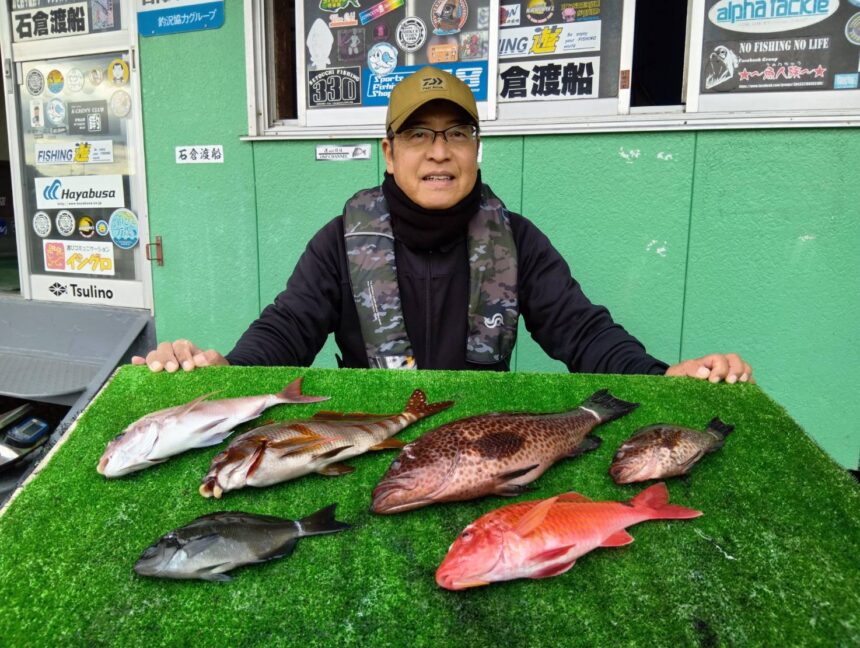 船外機ボートで荒木さんがマダイ、オオモンハタ、タカノハ、オジサン、グレをゲット。