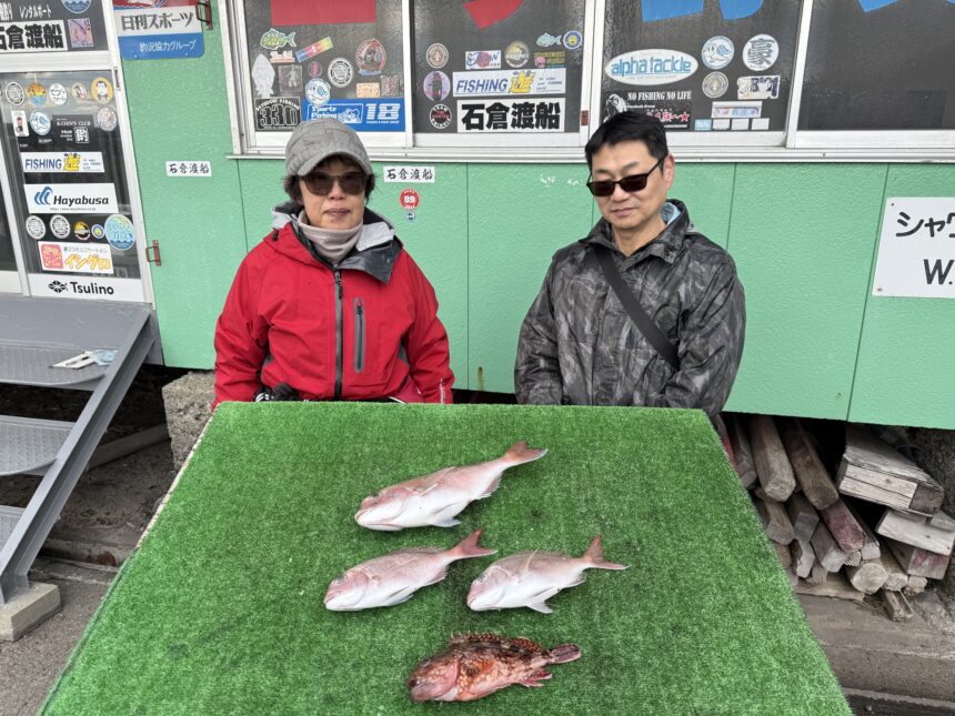 船外機ボートで山崎さんがマダイ、カサゴをゲット。