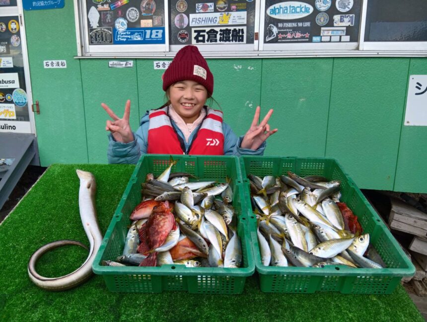 船外機ボートでサエちゃんがアジ、ハモ、カサゴをゲット。