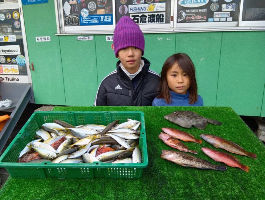 船外機ボートでアオタ君&ユイタ君がアジ、カワハギ、カサゴ、ベラをゲット。