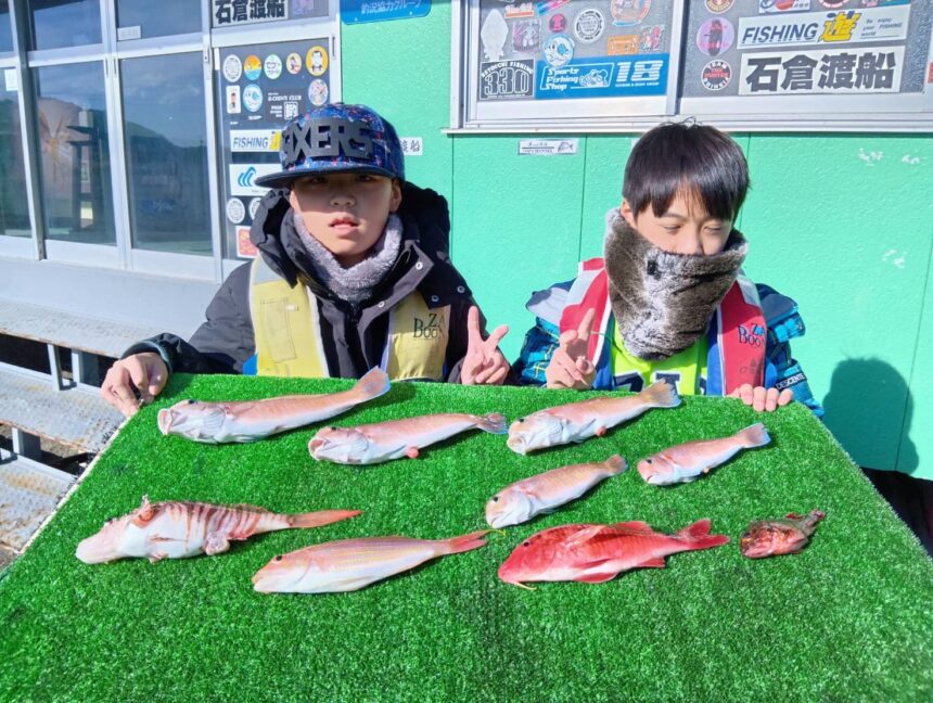 船外機ボートでりく君、ゆう君がシロアマダイ、ミノカサゴをゲット。