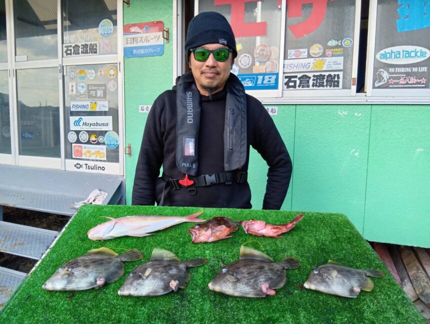船外機ボートで早川さんがカワハギ、イトヨリ、カサゴをゲット。
