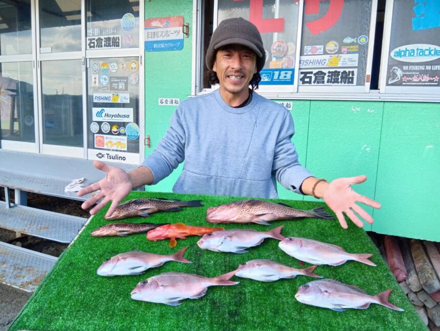 船外機ボートで斉藤さんがマダイ、オオモンハタ、アカハタをゲット。