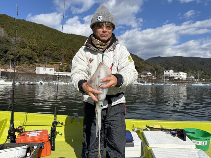 手漕ぎボートで板垣さんがアオリイカをゲット。