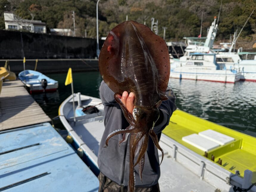 手漕ぎボートで板垣さんがアオリイカをゲット。