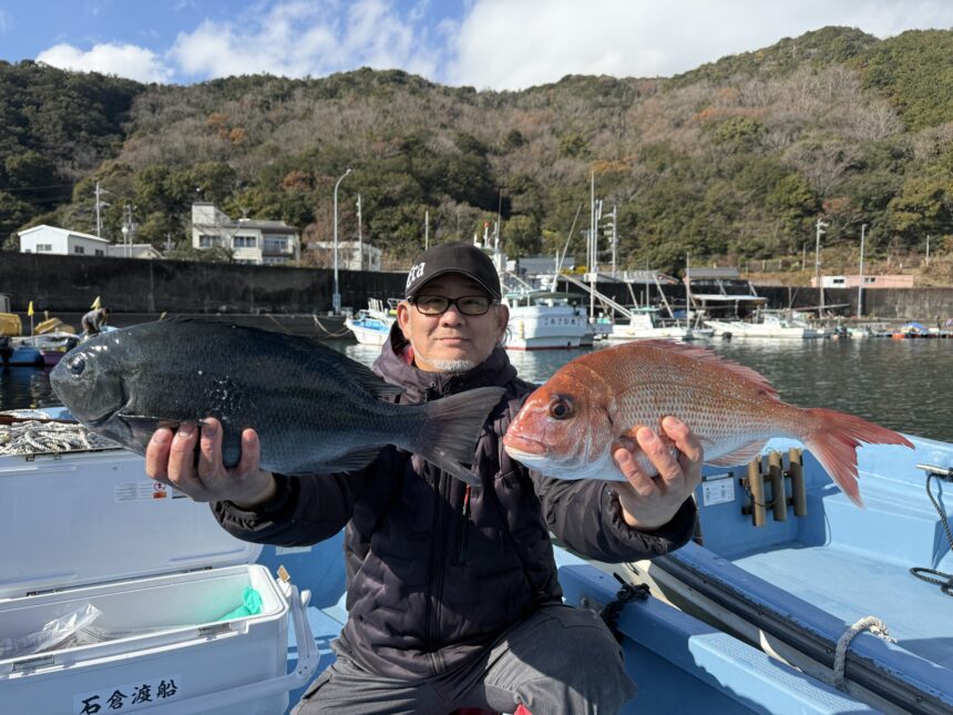 船外機ボートで海苔さんがマダイ、グレをゲット。
