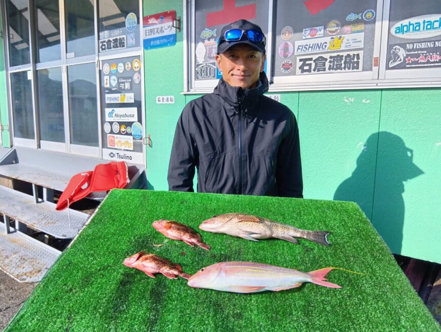 船外機ボートで小野さんがイトヨリ、オオモンハタ、カサゴをゲット。