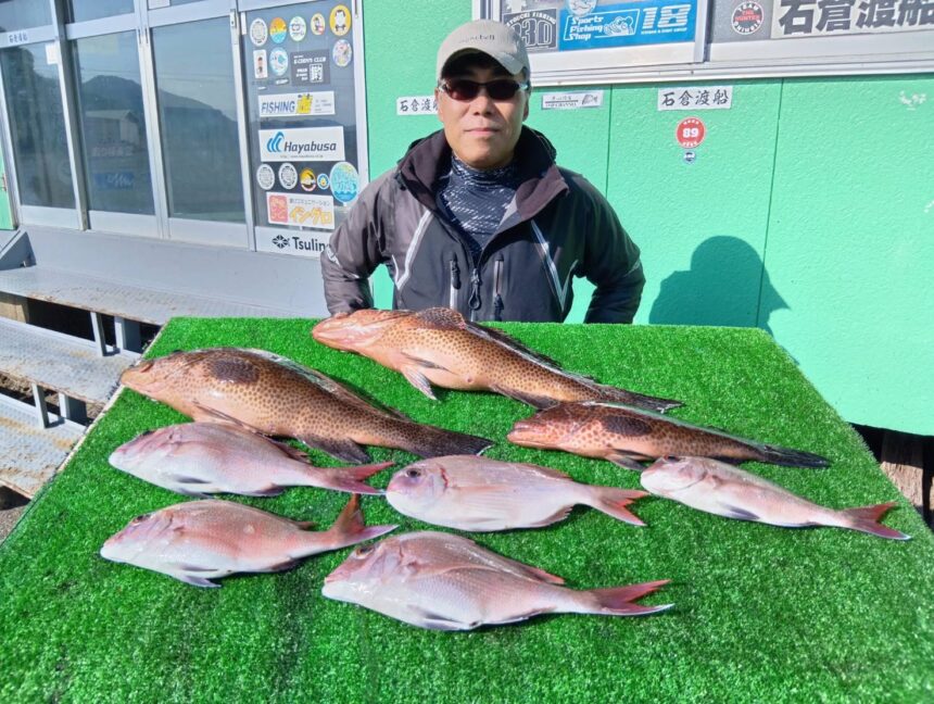 船外機ボートで杉浦さんがマダイ、オオモンハタをゲット。