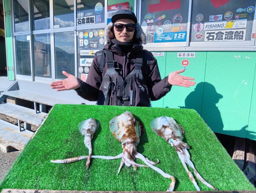 手漕ぎボートで板垣さんがアオリイカをゲット。
