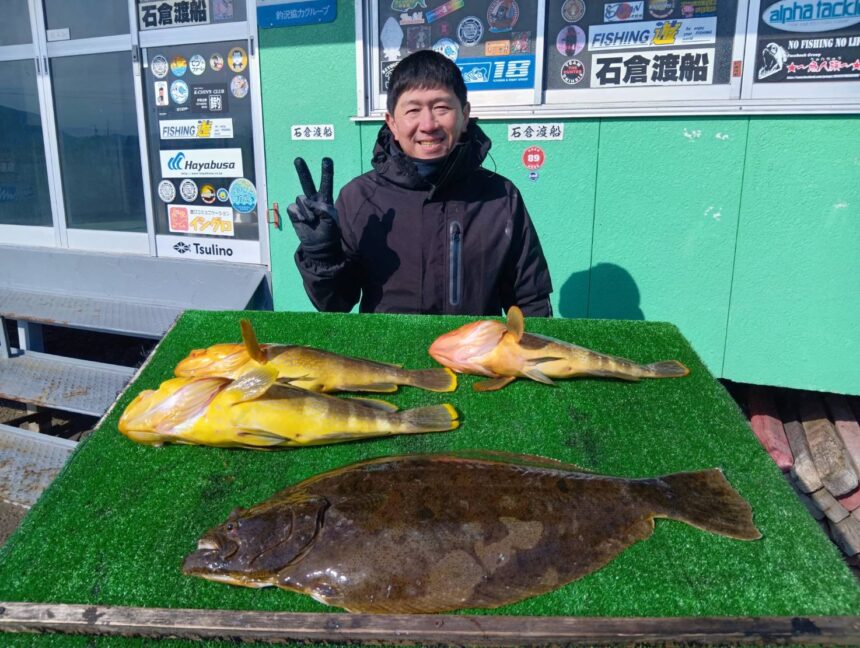 船外機ボートで徳田さんがヒラメ、アオハタをゲット。