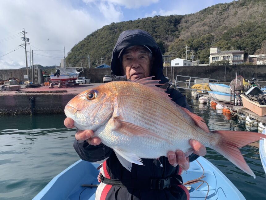 船外機ボートで田中さんがマダイをゲット。