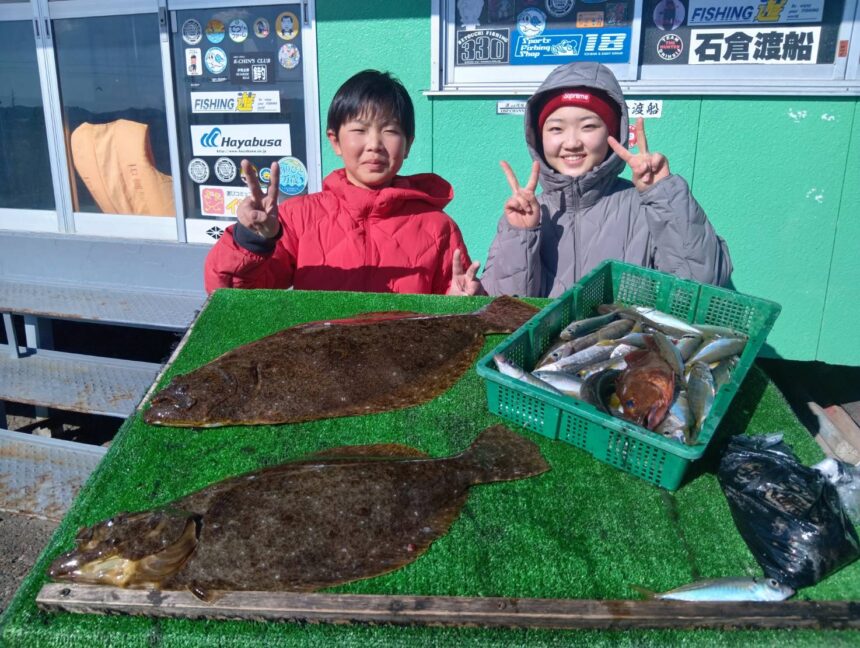 船外機ボートでかいと君&まいかちゃんがヒラメ、スミイカ、アジをゲット。
