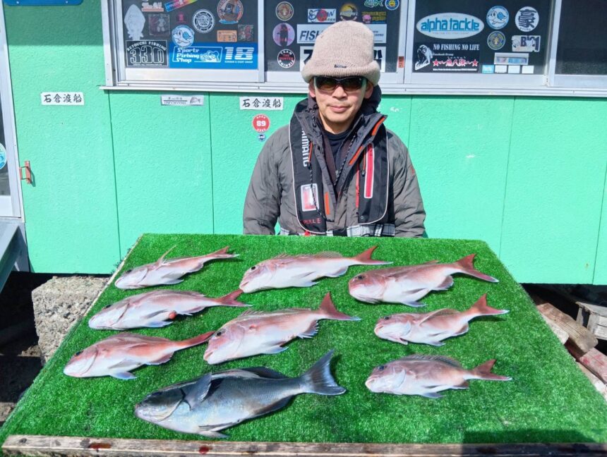 船外機ボートで小林さんがイシダイ、マダイ、ワラサをゲット。