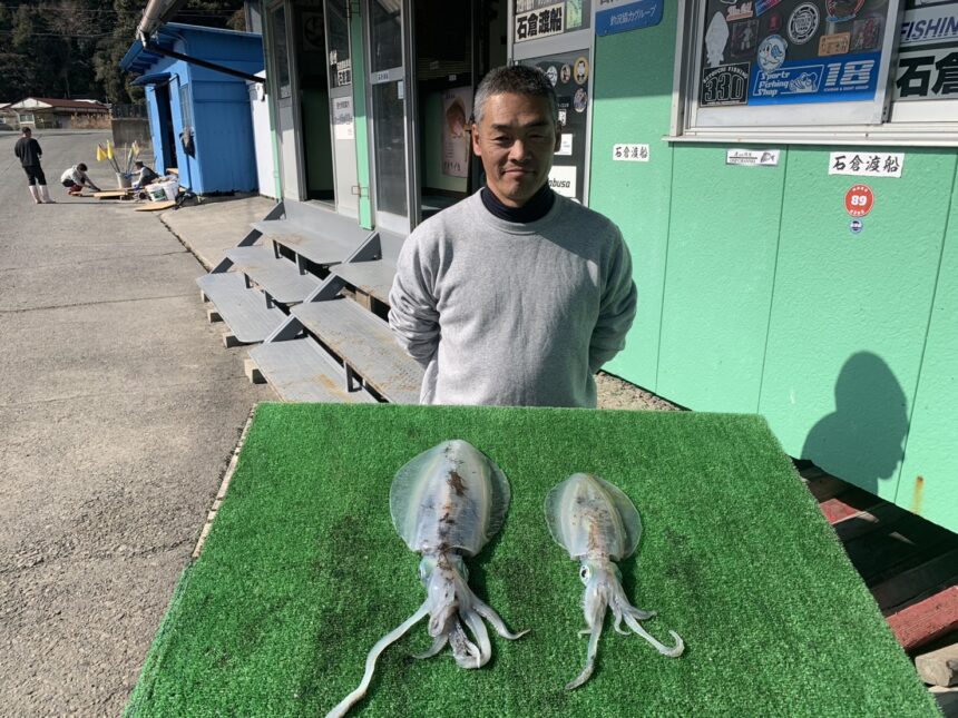船外機ボートで大野さんがアオリイカをゲット。